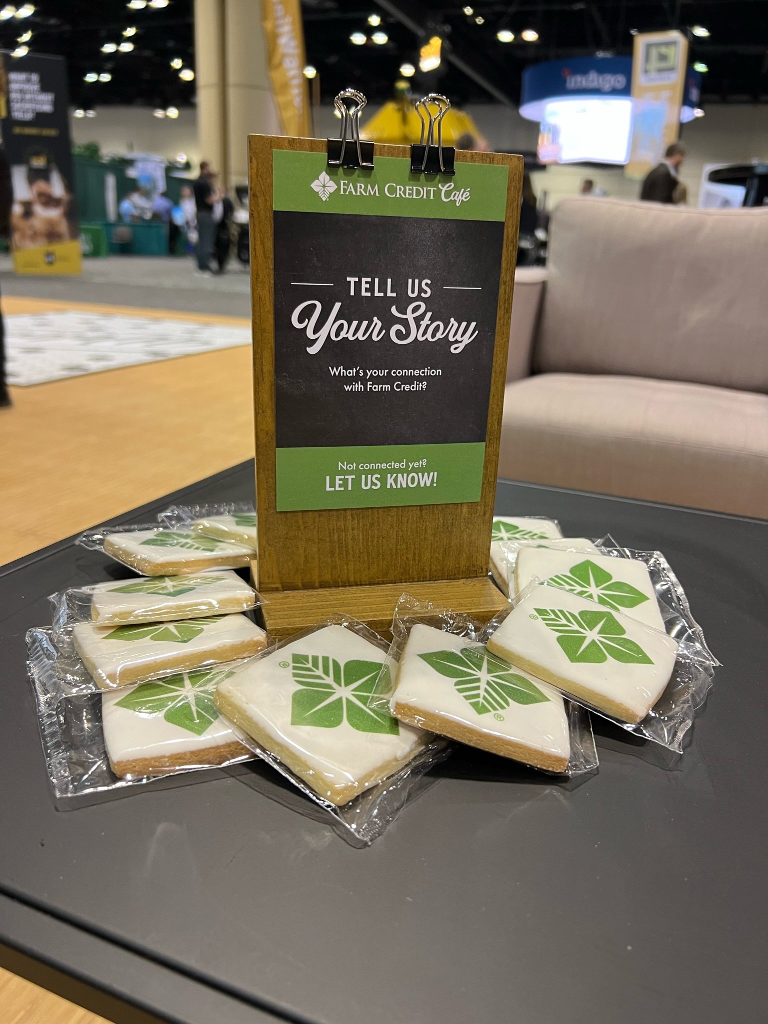 The concept of a coffee shop combines the inviting, warm ambiance of a café with Farm Credit's values. It creates an immersive experience that engages attendees. It’s a welcoming space for conversation and connection during a busy tradeshow experience. Everything from the individual furniture selections, shelf accessories, and marketing elements was intended to evoke the feeling of a modern coffee shop while creating a clear connection to the Farm Credit brand.